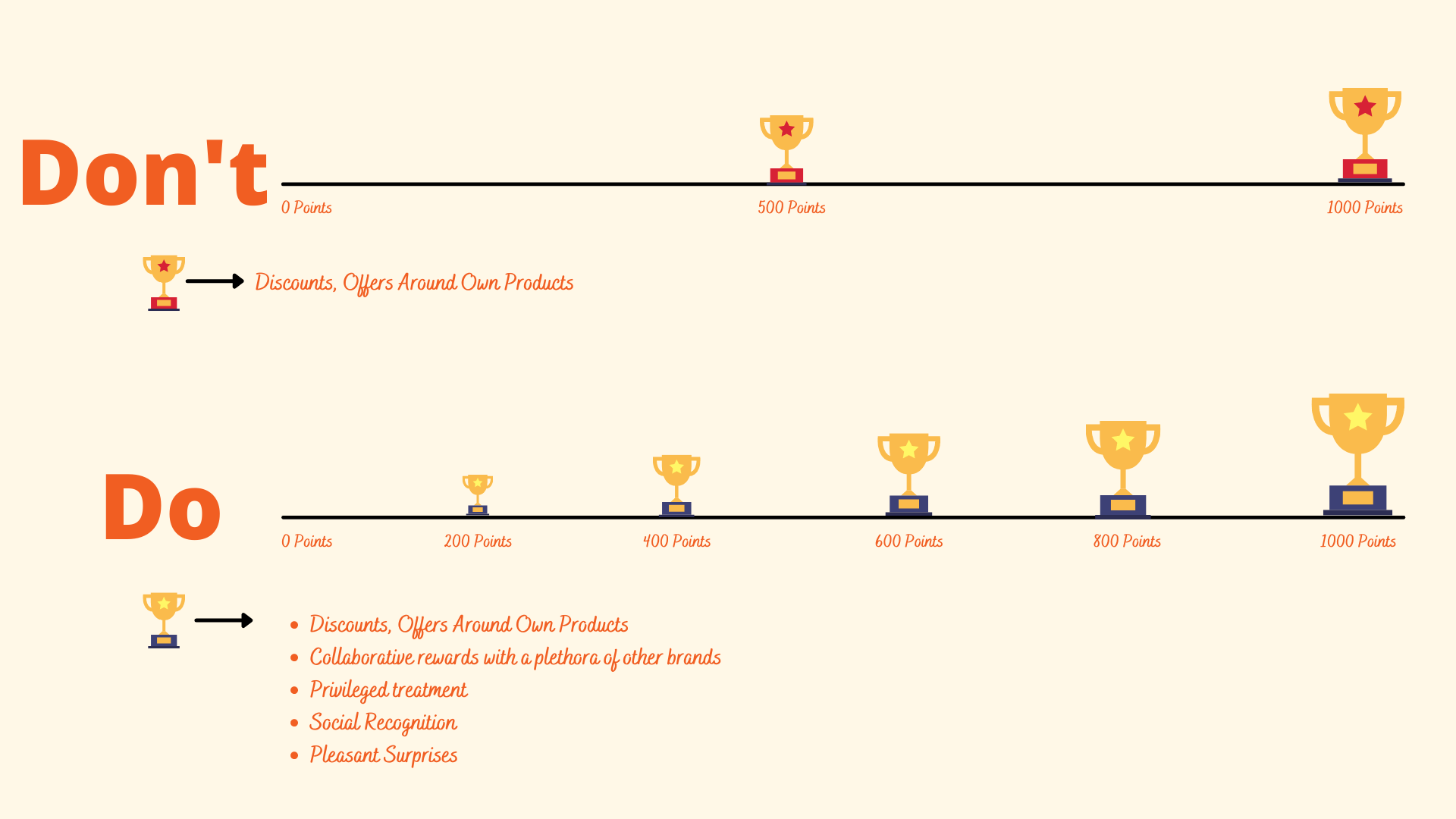 Also, try to keep the milestones of the reward point system for customers closely placed. So that user feels it easy to achieve the milestones. And with every milestone, the reward should keep getting bigger (So that customers keep coming back for more). The rewards should be a mixed bunch of stuff that makes the customer feel valued. These three things are instrumental in bringing the customer back to your product/service.